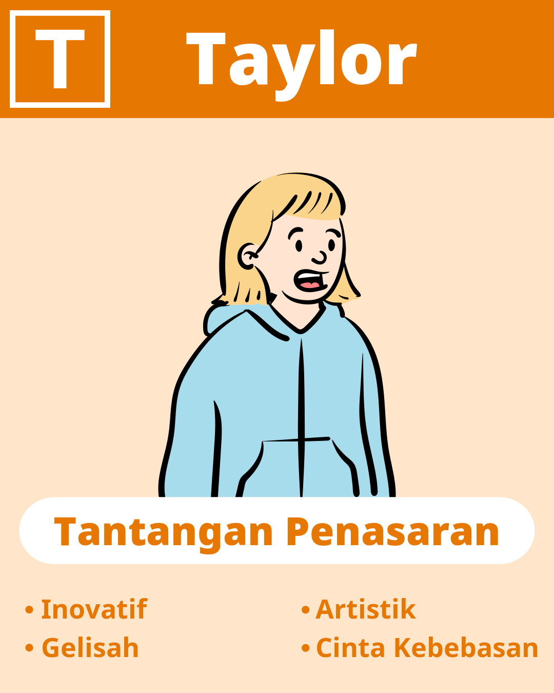 Taylor sangat penasaran dengan ide dan pengalaman baru dan mempertahankan sikap terbuka terhadap hal yang tidak diketahui. Salah satu karakteristiknya adalah pemikiran kreatif dan orisinal. Dia memiliki minat yang mendalam dalam seni dan kegiatan kreatif, serta memiliki rasa estetika yang sangat baik. Selain itu, Taylor mahir dalam berpikir abstrak dan memiliki kemampuan pemecahan masalah yang kuat. Dia tidak terikat oleh pemikiran tradisional atau kebijaksanaan konvensional, memungkinkannya untuk mengadopsi pendekatan inovatif. Namun, di sisi lain, dia menunjukkan sedikit minat pada detail praktis atau pekerjaan rutin dan cenderung tidak suka terikat oleh kerangka kerja dan aturan tradisional. Kekuatannya terletak pada fleksibilitas ekstrem dan kemampuannya untuk mempertimbangkan hal-hal dari berbagai perspektif.