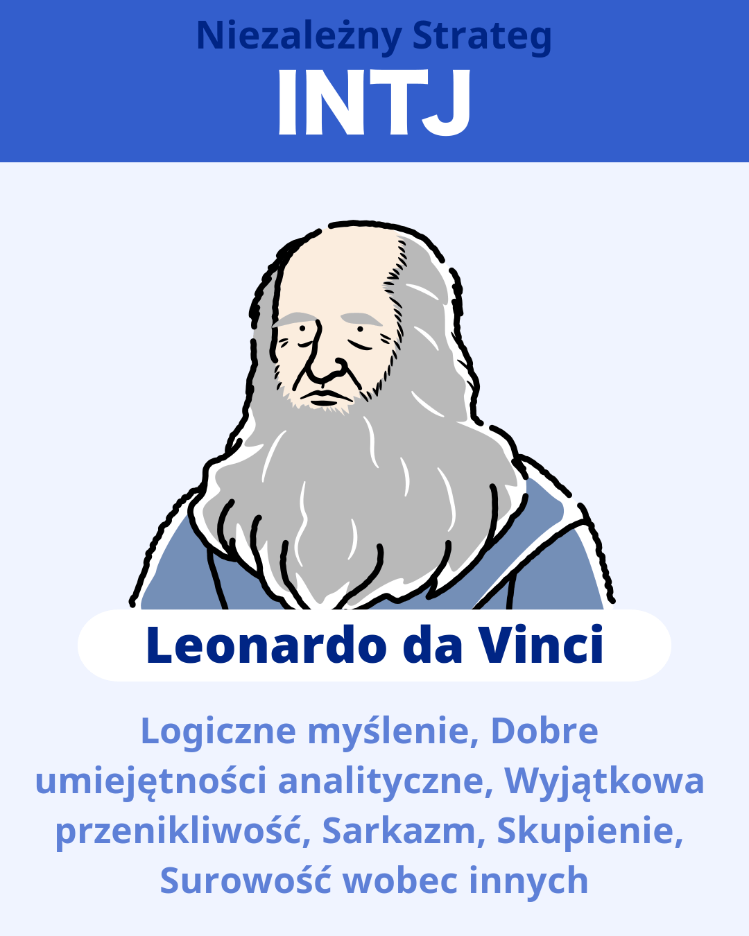 Ludzie z typem osobowości INTJ, znanym również jako strateg, są dobrzy w logicznym myśleniu i cechuje ich duża przenikliwość. Mają oryginalne pomysły, a ich perfekcjonistyczna natura często prowadzi do poświęcenia się wyłącznie własnym zainteresowaniom. Osoby INTJ wolą pracować w pojedynkę zamiast w zespole. Są dobre w dążeniu do ambitnych celów i rozwiązywaniu trudnych problemów, a ich cechy pozwalają im osiągać doskonałe wyniki w pracy. Są pewne siebie i mogą być w stosunku do siebie bardzo wymagające. Bywają też surowe dla innych i bywają w rezultacie odbierane jako aroganckie. Ponieważ osoby INTJ nie są dobre w komunikowaniu się i działaniu w przyjazny sposób, muszą być ostrożne, aby nie zostać źle zrozumiane i nie zyskać opinii trudnych w kontaktach.